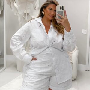 Sabemos que muitas mulheres têm receio de usar peças brancas. Por isso, este conjunto foi pensado para não ficar transparente, mesmo em ambientes claros. A modelagem da camisa veste com estrutura, não repuxa no busto e permite usar aberta ou fechada. Já o short tem cós elástico confortável, que ajusta sem apertar, não enrola e não sobe nas coxas.