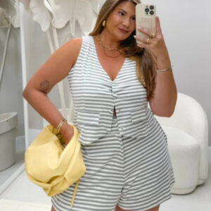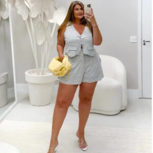 Sabemos que muitas clientes ficam em dúvida sobre conjuntos listrados, regata e short mais curtinho. Pensando nisso, esse modelo foi criado para resolver justamente essas inseguranças: