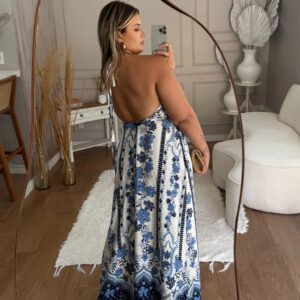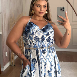 O Macacão Frente Única é a peça ideal para quem busca elegância com frescor. Com decote halter, amarração no pescoço e modelagem ampla, ele valoriza o colo e garante fluidez ao visual. A estampa ornamental em tons de azul e branco transmite sofisticação com toque mediterrâneo — perfeito para dias ensolarados ou eventos ao ar livre.
