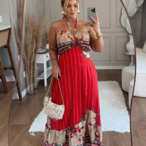 Modelagem: Vestido longo com busto em lastex e design versátil que permite diferentes formas de uso