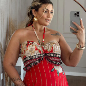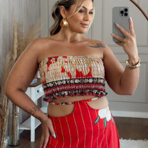 Parte superior com lastex e estampa étnica em tons de vermelho, preto e bege